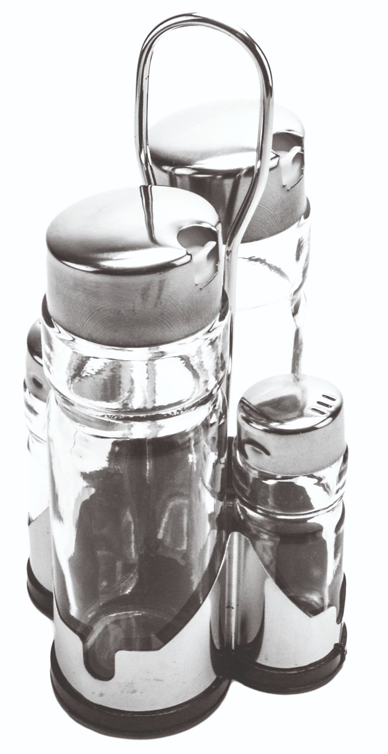 Περιλαμβάνει φιάλες για λάδι και ξύδι, αλατιέρα και πιπεριέρα.