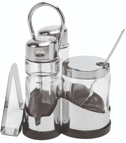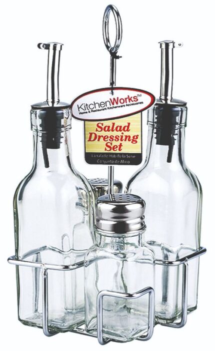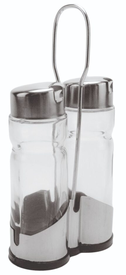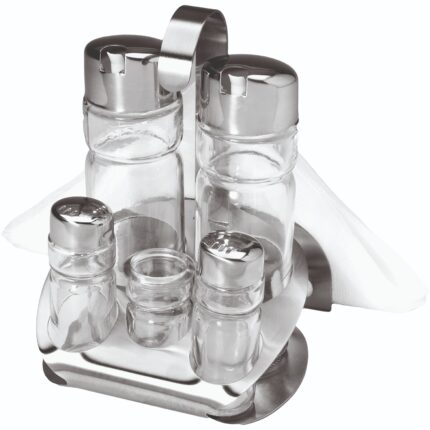 Περιλαμβάνει φιάλες για λάδι και ξύδι, αλατιέρα και πιπεριέρα.